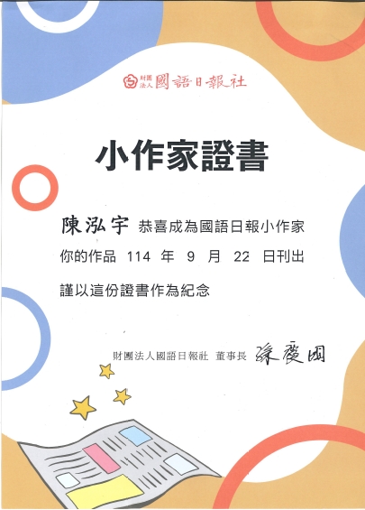恭喜~407陳泓宇榮獲國語日報9/22刊登第八版,感謝張瓊美老師用心指導。